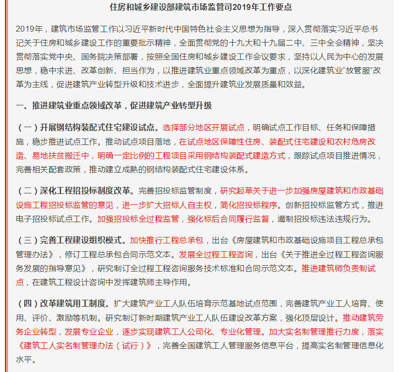 剛剛,《住房和城鄉(xiāng)建設(shè)部建筑市場監(jiān)管司2019年工作要點》正式印發(fā)。2019年建筑業(yè)重點領(lǐng)域改革力度,可謂前所未有!